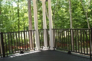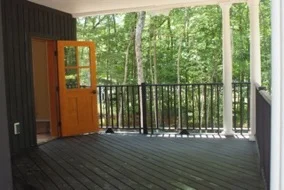 This is the webcam view showing the dining room deck for outdoor meals and the area for bike storage.