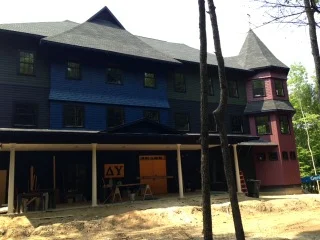 I don’t know if all of you have been watching through the Alumni Website over the summer as the house has progressed through construction. I have just added numerous new pictures that can’t be seen from the webcam. They have now started on landscaping as the exterior is just about complete except for the front path and and front railings which are tied to the landscaping. I understand all but a few details remain to complete the inside of the house and some of those minor details will be completed by the University when you move into the house. I know for instance that the Lambda Iota original fraternity crest over the Fireplace is being carved by the manufacturer at this time.